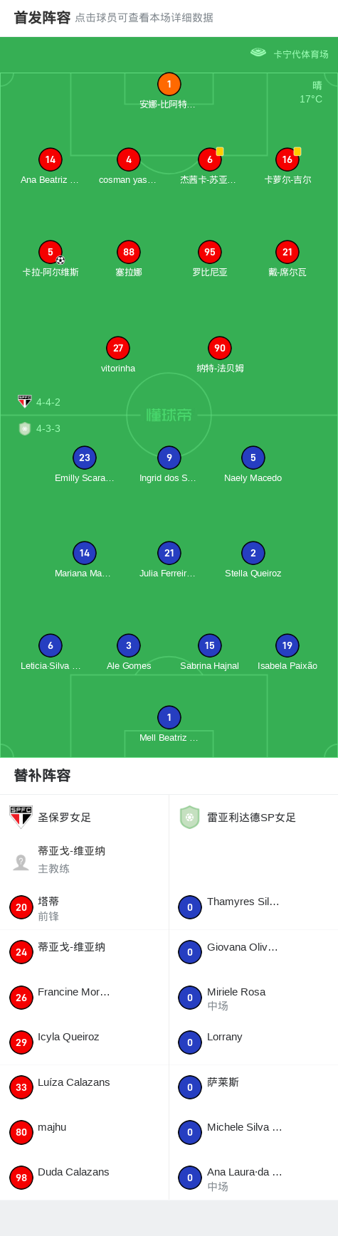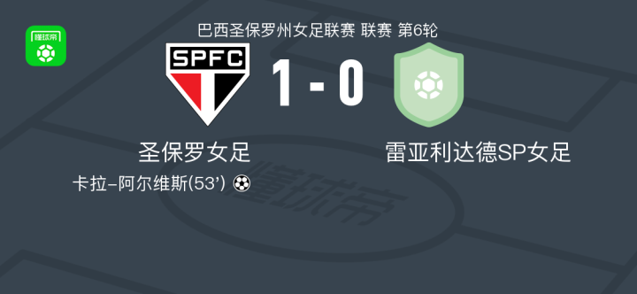 圣保罗女足1-0雷亚利达德SP女足,卡拉-阿尔维斯打进全场唯一进球战报bot @懂球帝2025-08-14 06:51北京时间8月14日,在巴西圣保罗州女足联赛第6轮的一场比赛中,圣保罗女足坐镇主场迎战雷亚利达德SP女足。比赛中,圣保罗女足球员卡拉-阿尔维斯在第53分钟攻入全场唯一进球。最终,圣保罗女足以1-0战胜雷亚利达德SP女足。点击查看本场比赛详细数据>>精彩瞬间第53分钟,圣保罗女足球员卡拉-阿尔维斯打入一球。 球队阵容 技术统计 展开更多