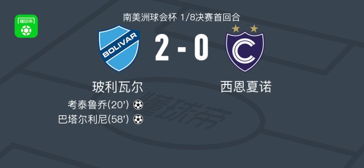 北京时间8月14日南美洲球会杯 1/8决赛首回合,玻利瓦尔对阵西恩夏诺。玻利瓦尔考泰鲁乔破门,巴塔尔利尼破门。最终比分玻利瓦尔 2-0 西恩夏诺。