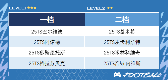 25TS在中场后腰位置的补充不算大,“蓝卡常客”阿诺德依然是最值得推荐的后腰,他在中场的带球推进能力以及搓射手感是其他球员所不具备的,而且新卡提升了抢断数值,让他在防守端的效果更明显。多斯桑托斯对切尔西套是很有力的补充,几乎是25TS赛季里最出色的六边形球员,攻防数值都拉满,还有一脚非常精准的远射。而格拉芬贝克的新卡比24U赛季也提升了一大截,相比其他大模型后腰,他的4逆足和瘦弱模型能够保障出球质量,在进攻端的发挥也更稳定。他和多斯桑托斯都是29工资,相对偏高,如果是组TS套的话,可以考虑使用25工资的23TS戈雷茨卡金卡加保护慢慢合高强。