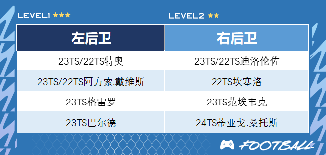 25TS的边后卫最低工资也在27,除非中前场全部使用妖人,否则很难有出场机会。因此,这里推荐的边后卫还是前两个赛季蓝较低工资的边后卫,包括了特奥、坎塞洛、迪洛伦佐等模型不错也具备一定速率的老牌边后卫,不过因为TS套的盛行,目前有些溢价。