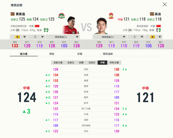前锋位置首当其冲推荐黄紫昌,这名曾经的国足新星为江苏队效力过4年,贡献了5球7助攻,是帮助苏宁夺得中超冠军的一大功臣。CSL赛季卡普遍有着逆足不足的问题,而黄紫昌则是中前场唯一一名双五脚的球员,尽管射门和传中都相对一般,但双五脚能够保障出球下限。另一名前锋高迪曾于2017年租借加盟江苏队,也是中超赛场的名将,跑动勤勉,射术精湛。