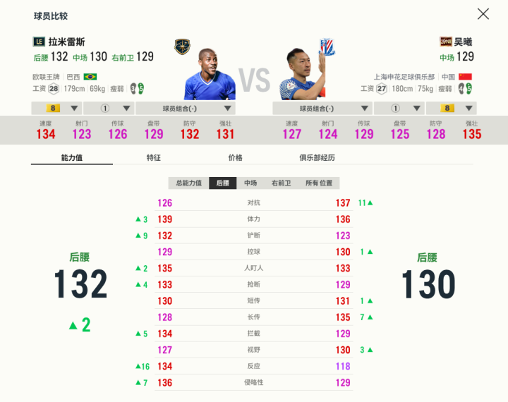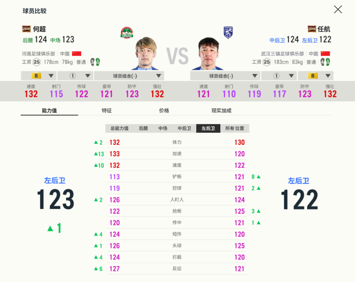 任航和何超都是几年前本土的优秀防守球员,任航有一脚任意球本领,何超的防守侵略性更强,脚下速率快。他们在游戏里的对抗都非常不错,可以应对常规的边锋突击手。