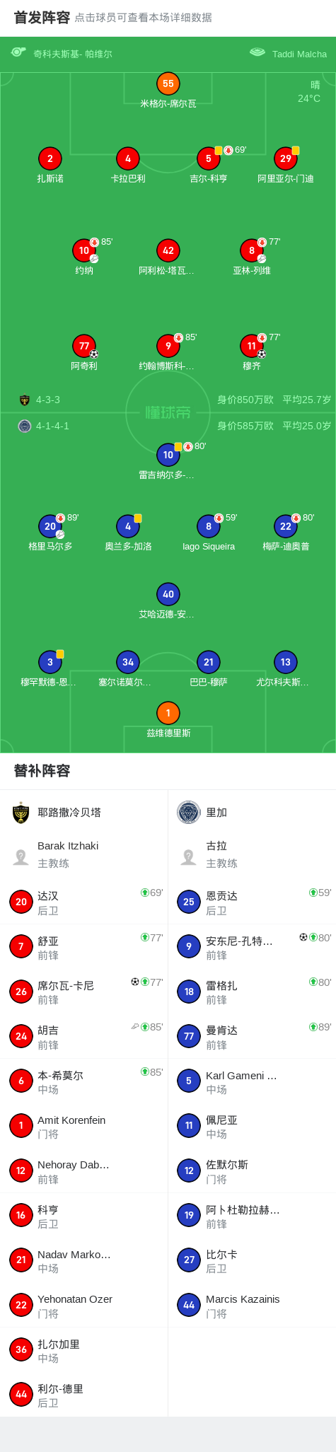 耶路撒冷贝塔3-1里加,席尔瓦-卡尼破门,穆齐建功