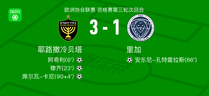 北京时间8月15日欧洲协会联赛 资格赛第三轮次回合,耶路撒冷贝塔对阵里加。耶路撒冷贝塔阿奇利破门,穆齐破门,席尔瓦-卡尼破门。里加安东尼-孔特雷拉斯破门。最终比分耶路撒冷贝塔 3-1 里加。两回合总比分耶路撒冷贝塔3-4里加。