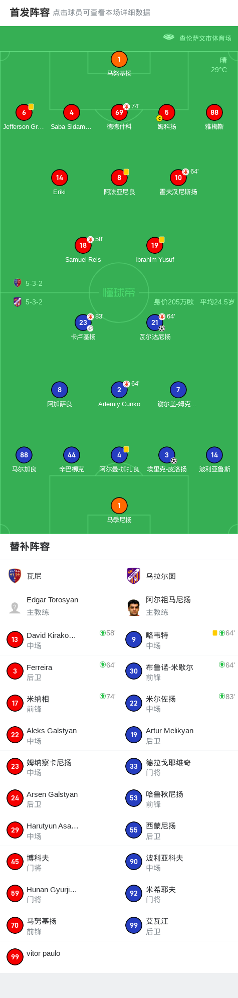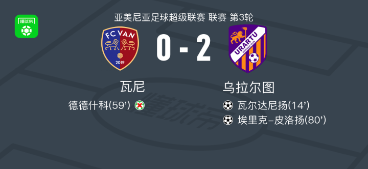北京时间8月15日亚美尼亚足球超级联赛 联赛 第3轮,瓦尼主场对阵乌拉尔图。乌拉尔图瓦尔达尼扬破门,埃里克-皮洛扬破门。最终比分瓦尼 0-2 乌拉尔图。