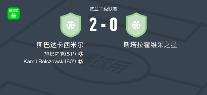 斯巴达卡西米尔2-0斯塔拉霍维采之星,施塔内克破门,Kamil Belczowski锁定胜局