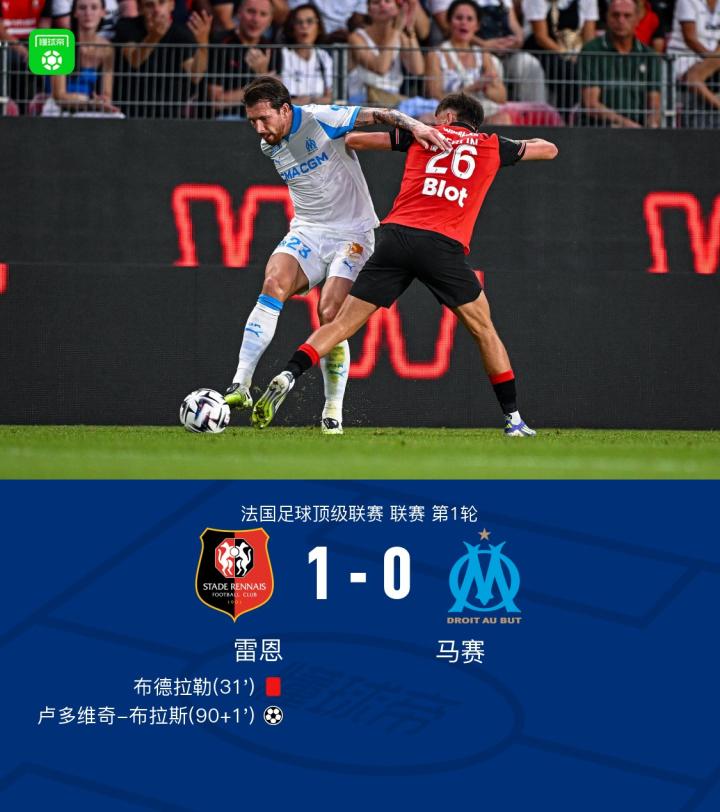 北京时间8月16日,法国足球顶级联赛第1轮,雷恩坐镇主场迎战马赛。上半场,布德拉勒染红,拉比奥和穆里略射门相继击中门框。下半场最后时刻,布拉斯单刀破门。全场比赛结束,十人雷恩1-0力克马赛。