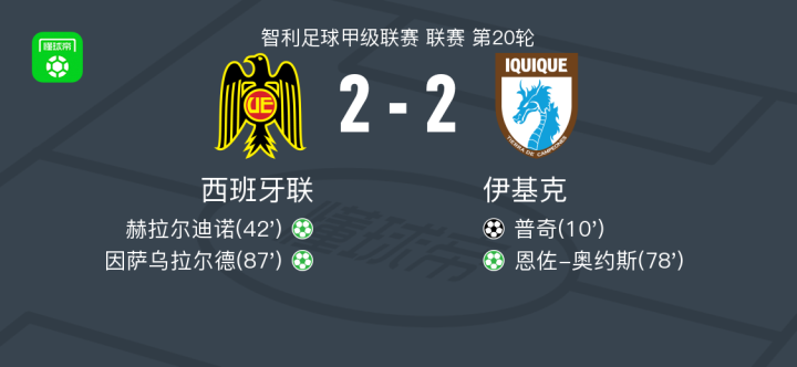 北京时间8月16日,智利足球甲级联赛第20轮,西班牙联坐镇主场迎战伊基克。比赛中,伊基克由塞萨尔-富恩特斯助攻普奇率先破门;随后,西班牙联由赫拉尔迪诺点射扳平比分;进入下半场,恩佐-奥约斯为伊基克再度取得领先;比赛尾声阶段,因萨乌拉尔德冷静罚入点球,帮助西班牙联将比分最终定格在2-2。