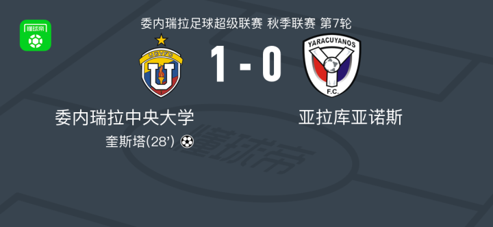 委内瑞拉中央大学1-0亚拉库亚诺斯,奎斯塔一锤定音