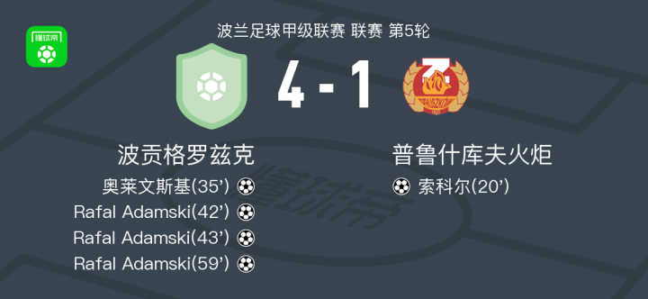 北京时间8月17日波兰足球甲级联赛第5轮,波贡格罗兹克主场迎战普鲁什库夫火炬。比赛中,普鲁什库夫火炬球员索科尔在第20分钟接队友Pawel Moskwik助攻首开纪录。随后,波贡格罗兹克展开强势反击,第35分钟,Karol Noiszewski助攻奥莱文斯基扳平比分。第42分钟,Igor Korczakowski送出助攻,Rafal Adamski帮助波贡格罗兹克反超比分。仅过一分钟,波贡格罗兹克球员阿德科尼斯再次助攻Rafal Adamski破门,将比分扩大为3比1。第59分钟,Rafal Adamski再下一城,完成本场比赛个人帽子戏法。最终,波贡格罗兹克以4比1战胜普鲁什库夫火炬。