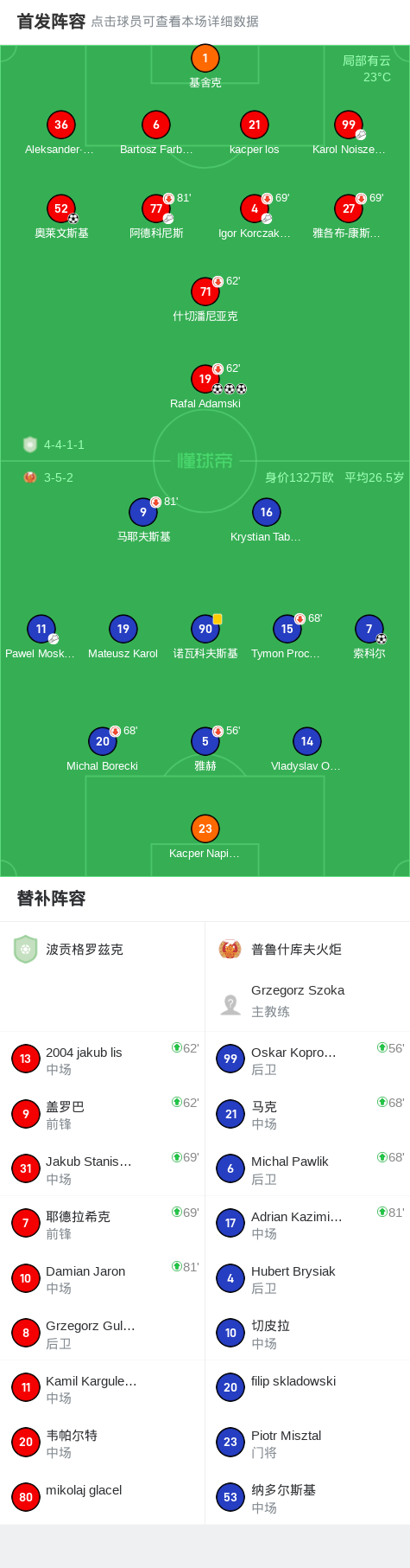第20分钟,普鲁什库夫火炬球员Pawel Moskwik助攻索科尔打入一球。