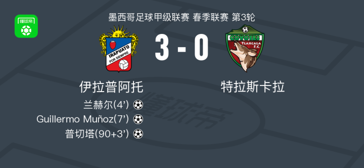 伊拉普阿托3-0大胜特拉斯卡拉,普切塔破门,Guillermo Muñoz建功