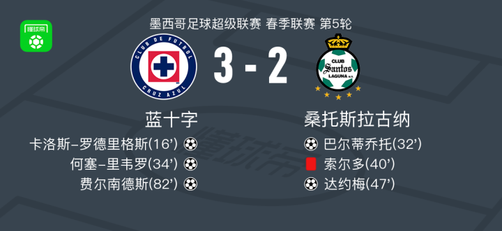 北京时间8月17日墨西哥足球超级联赛 春季联赛 第5轮,蓝十字主场对阵桑托斯拉古纳。蓝十字卡洛斯-罗德里格斯破门,何塞-里韦罗破门,费尔南德斯破门。桑托斯拉古纳巴尔蒂乔托破门,达约梅破门。最终比分蓝十字 3-2 桑托斯拉古纳。