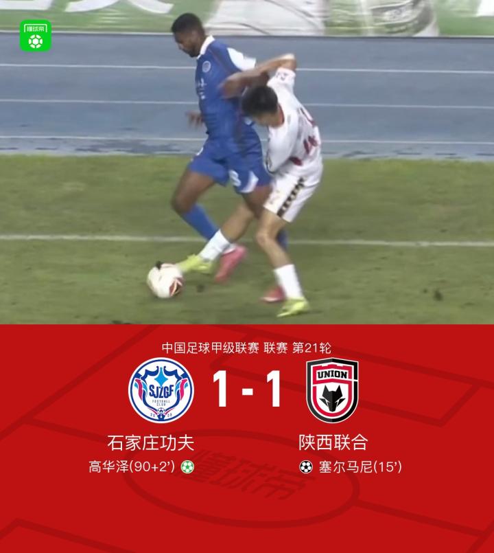 石家庄功夫1-1陕西联合,塞尔马尼破门,高华泽点射绝平