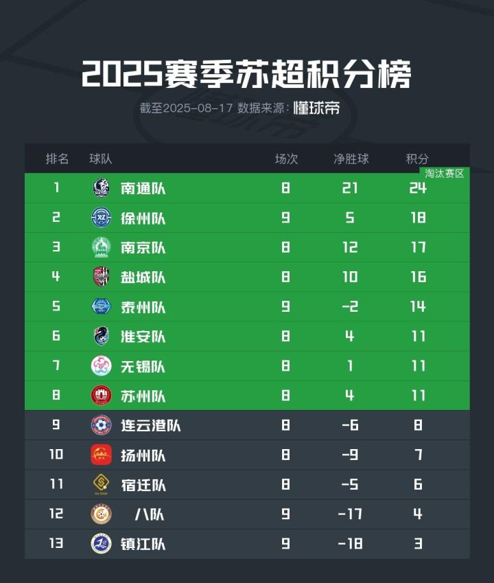 苏超最新积分榜:南通八战全胜继续领跑,常州取首胜摆脱垫底ETChalmers @懂球帝2025-08-17 21:54北京时间8月17日,江苏省城市足球联赛第9轮比赛全部战罢,在最新积分榜上,在5-0大胜连云港后,八战全胜的南通队继续领跑,南京队在3-2击败盐城队后升至第三,常州队1-0击败镇江队收获首胜后摆脱垫底。苏超第9轮赛果苏州队1-1泰州队常州队1-0镇江队无锡队3-3徐州队扬州队1-0淮安队南京队3-2盐城队南通队5-0连云港队展开更多