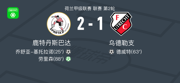 北京时间8月17日,荷兰甲级联赛第2轮,鹿特丹斯巴达主场迎战乌德勒支。比赛第25分钟,范安霍尔特送出助攻,乔舒亚-基托拉诺破门得分,为鹿特丹斯巴达首开纪录。第63分钟,乌德勒支球员德威特抓住机会扳平比分。比赛进入尾声阶段,第88分钟,劳里森主罚点球命中,帮助鹿特丹斯巴达再度领先。最终,鹿特丹斯巴达以2-1战胜乌德勒支,全取三分。