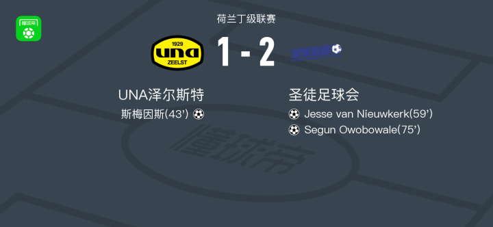 北京时间8月17日,在荷兰丁级联赛的一场比赛中,UNA泽尔斯特坐镇主场迎战圣徒足球会。比赛中,UNA泽尔斯特球员斯梅因斯成功破门,为球队取得领先。圣徒足球会由Jesse van Nieuwkerk和Segun Owobowale分别建功,最终客场以2比1逆转取胜。