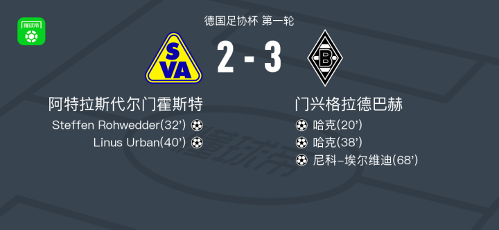 门兴格拉德巴赫3-2阿特拉斯代尔门霍斯特,哈克两球,尼科-埃尔维迪破门
