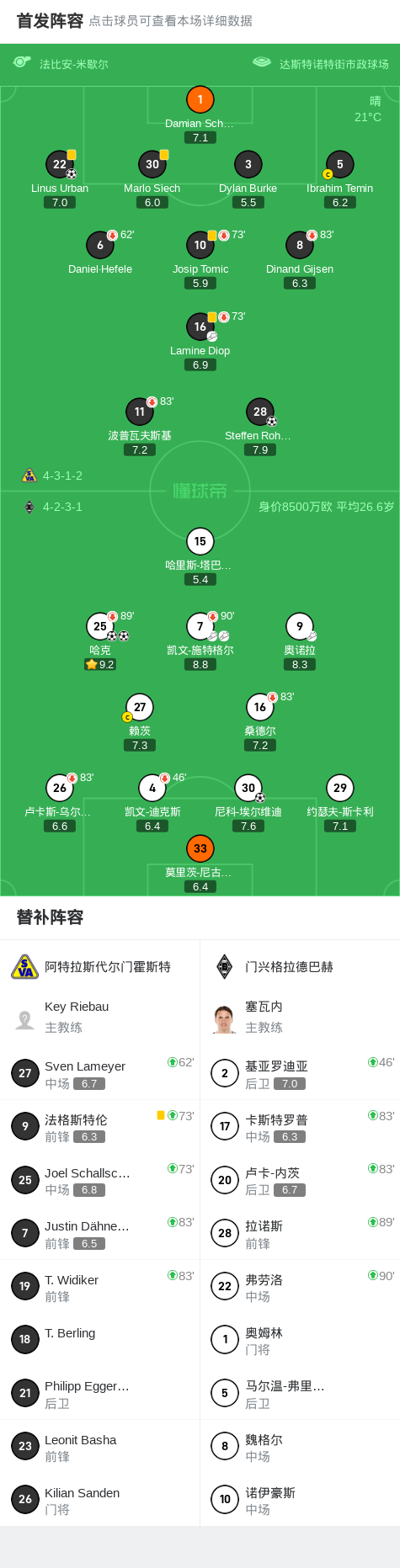 第32分钟,阿特拉斯代尔门霍斯特球员Lamine Diop助攻Steffen Rohwedder打入一球。