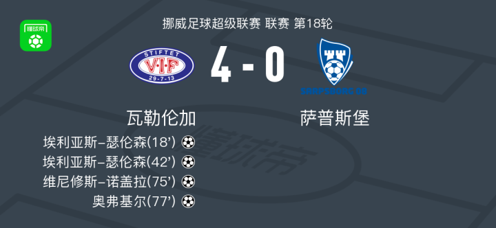 瓦勒伦加4-0大胜萨普斯堡,埃利亚斯-瑟伦森梅开二度,奥弗基尔传射