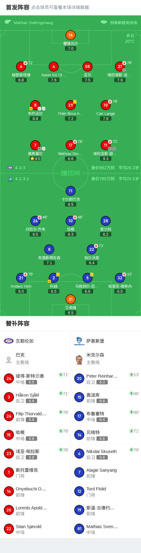 第42分钟,瓦勒伦加球员奥弗基尔助攻埃利亚斯-瑟伦森打入一球。