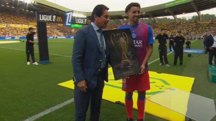 他将一幅镶有金色欧冠奖杯和埃菲尔铁塔图案的黑色相框交到对方手中,同时还准备了一座极具创意的巧克力奖杯:一边是南特的黄绿色队徽色彩,另一边则是巴黎的红蓝配色。