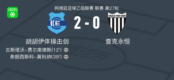 北京时间8月18日,阿根廷足球乙级联赛第27轮,胡胡伊体操击剑坐镇主场迎战查克永恒。比赛中,胡胡伊体操击剑展现出色配合,由古斯塔沃-费尔南德斯和弗朗西斯科-莫利纳各入一球,分别在第12分钟和第39分钟完成破门。亚历杭德罗-金塔纳两次送出精准助攻,为球队奠定胜局。最终,胡胡伊体操击剑以2比0战胜查克永恒,全取三分。