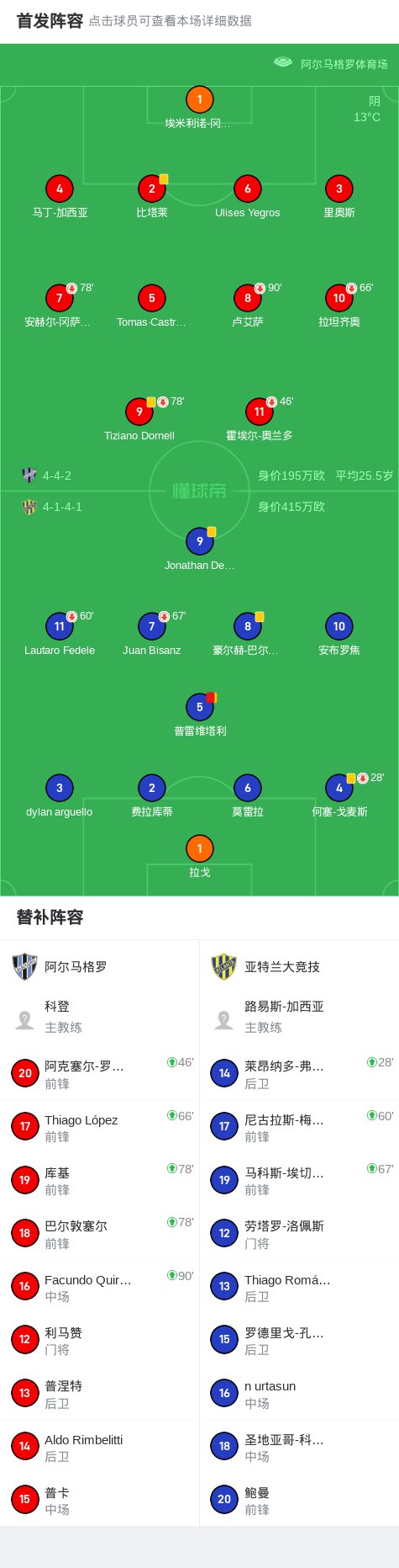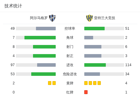 阿尔马格罗0-0亚特兰大竞技,场面火爆,两队7人染黄