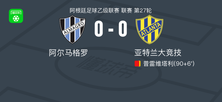 北京时间8月18日阿根廷足球乙级联赛 联赛 第27轮,阿尔马格罗主场对阵亚特兰大竞技。最终比分阿尔马格罗 0-0 亚特兰大竞技。