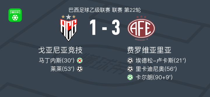 北京时间8月18日,巴西足球乙级联赛第22轮,戈亚尼亚竞技坐镇主场迎战费罗维亚里亚。比赛过程中,费罗维亚里亚球员埃德松-卢卡斯接队友法布里西奥-丹尼尔助攻先拔头筹。戈亚尼亚竞技球员莱莱随后接队友路易藏妙传成功破门,为主队扳回一城。下半场费罗维亚里亚球员里卡迪尼奥由古斯塔沃-梅迪纳助攻再度建功。比赛进入下半场补时阶段,费罗维亚里亚球员卡尔朗罚入点球锁定胜局。最终全场比赛结束,戈亚尼亚竞技主场1-3不敌费罗维亚里亚。