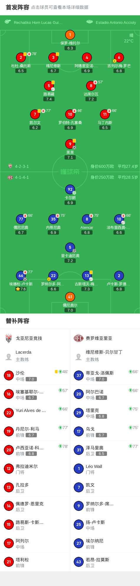 费罗维亚里亚3-1戈亚尼亚竞技,卡尔朗点射,里卡迪尼奥建功