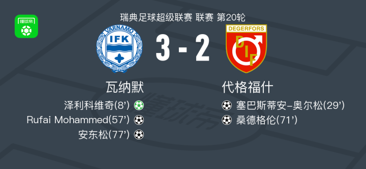 北京时间8月19日瑞典足球超级联赛 联赛 第20轮,瓦纳默主场对阵代格福什。瓦纳默泽利科维奇破门,Rufai Mohammed破门,安东松破门。代格福什塞巴斯蒂安-奥尔松破门,桑德格伦破门。最终比分瓦纳默 3-2 代格福什。