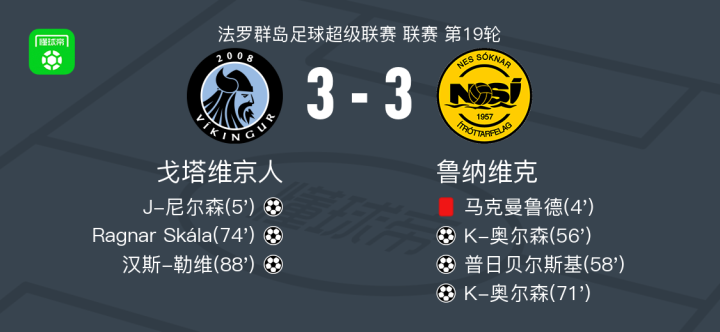 北京时间8月19日法罗群岛足球超级联赛 联赛 第19轮,戈塔维京人主场对阵鲁纳维克。戈塔维京人J-尼尔森破门,Ragnar Skála破门,汉斯-勒维破门。鲁纳维克K-奥尔森梅开二度,普日贝尔斯基破门。最终比分戈塔维京人 3-3 鲁纳维克。