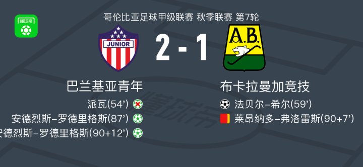 巴兰基亚青年2-1逆转布卡拉曼加竞技,安德烈斯-罗德里格斯包办2球