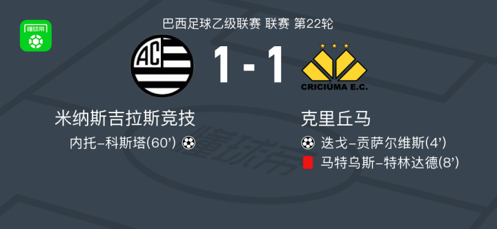 北京时间8月19日巴西足球乙级联赛 联赛 第22轮,米纳斯吉拉斯竞技主场对阵克里丘马。米纳斯吉拉斯竞技内托-科斯塔破门。克里丘马迭戈-贡萨尔维斯破门。最终比分米纳斯吉拉斯竞技 1-1 克里丘马。