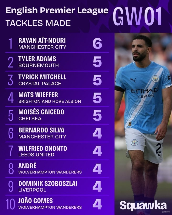 新赛季英超第一轮比赛已经全部结束,根据统计,艾特-努里是本轮比赛抢断次数最多的球员,泰勒-亚当斯、米切尔、魏费尔、凯塞多位居第二。