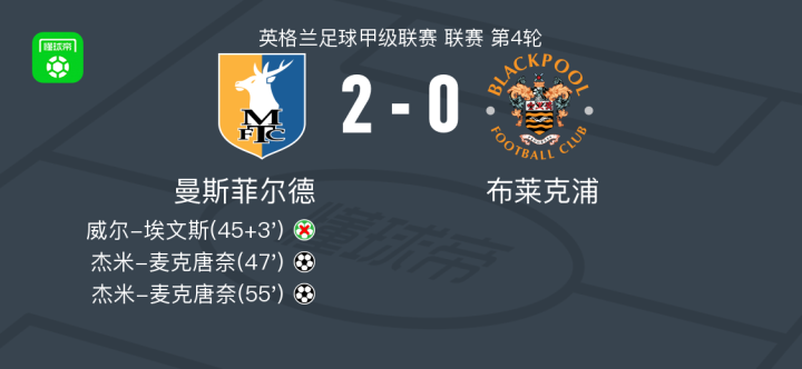 曼斯菲尔德2-0布莱克浦,杰米-麦克唐奈独中两元