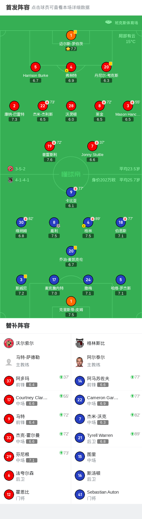 格林斯比1-0沃尔索尔,扈利一剑封喉战报bot @懂球帝2025-08-20 05:02北京时间8月20日,在英格兰足球乙级联赛第4轮的比赛中,沃尔索尔坐镇主场迎战格林斯比。比赛中,格林斯比球员扈利在关键时刻攻入全场唯一进球。最终,格林斯比以1比0客场取胜,全取三分。点击查看本场比赛详细数据>>点击查看英乙完整积分榜>>精彩瞬间第68分钟,格林斯比球员扈利打入一球。 球队阵容 技术统计 展开更多