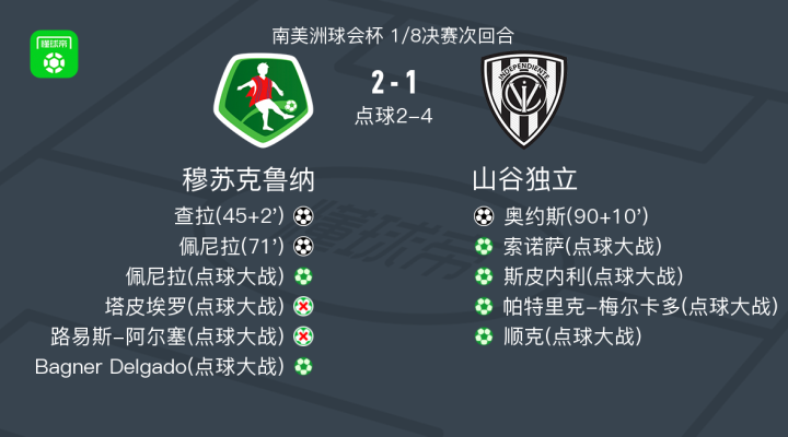 北京时间8月20日南美洲球会杯 1/8决赛次回合,穆苏克鲁纳对阵山谷独立。穆苏克鲁纳查拉破门,佩尼拉破门。山谷独立奥约斯破门。最终比分穆苏克鲁纳 4-5 山谷独立。两回合总比分穆苏克鲁纳4-6山谷独立。