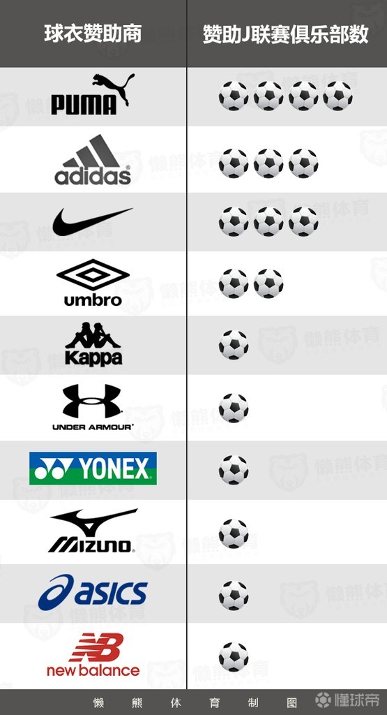 ▲各个品牌在J1联赛赞助球队数量