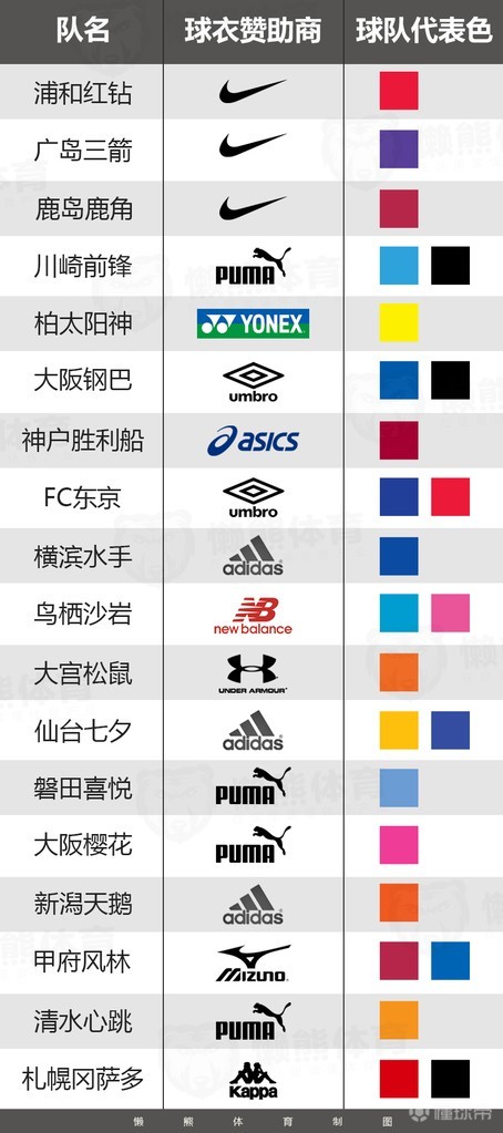 2017年,J1联赛18家俱乐部的球衣赞助商不仅包括体育用品两大巨头耐克和阿迪达斯等国外知名品牌,其国产品牌美津浓、亚瑟士也持续展现强劲势头。其中,彪马(Puma)成为了赞助J1球队最多(4支)的体育用品品牌。耐克、阿迪达斯、茵宝(Umbro)分别赞助3、3、2支球队。
