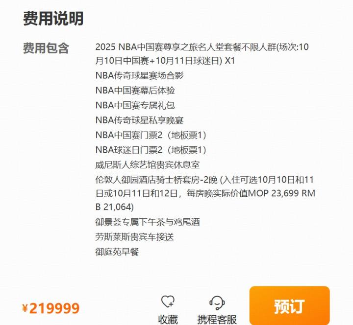 NBA中国赛票价:最低435,最高22207元,另有22万元顶级套餐蓝司机学姐 @懂球帝2025-08-20 16:272025NBA中国赛将于北京时间10月10日和12日在中国澳门进行,对阵双方为太阳和篮网。今日NBA中国官方公布了票务信息。据票务信息显示,NBA中国赛的最低票价为488澳门币(约435人民币),最高票价为24888澳门币(约22207人民币),另外,携程还推出了包含酒店和合影、晚宴等活动的顶级套餐,售价为219999元。展开更多