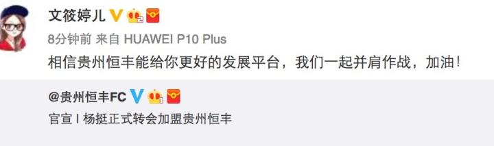 北京时间2月9日下午15:00,贵州恒丰足球俱乐部官方宣布了前广州富力后卫杨挺正式加盟球队的消息。随后,贵州恒丰的董事长文筱婷转发这条微博,并且向正式加盟球队的杨挺送上了问候。