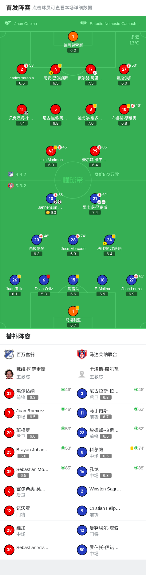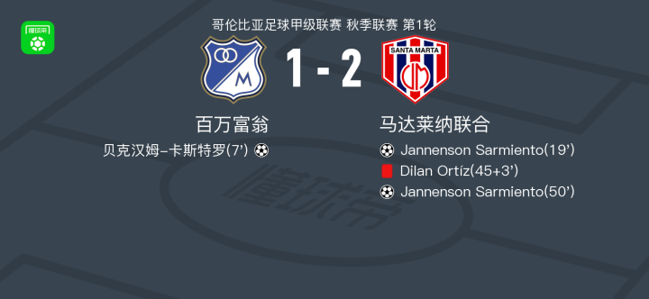 北京时间8月21日,哥伦比亚足球甲级联赛秋季联赛第1轮,百万富翁坐镇主场迎战马达莱纳联合。比赛中,百万富翁球员豪尔赫-阿里亚斯送出精准传球,助攻贝克汉姆-卡斯特罗破门得分。马达莱纳联合方面,Jannenson Sarmiento表现出色,先后接队友里卡多-马克斯的助攻完成梅开二度。上半场补时阶段,马达莱纳联合球员Dilan Ortíz因犯规动作过大被红牌罚下,令球队陷入被动。易边再战,马达莱纳联合虽少打一人,但仍凭借顽强斗志掌控比赛节奏,并由Jannenson Sarmiento再入一球锁定胜局。最终,全场比赛结束,百万富翁以1比2不敌马达莱纳联合。