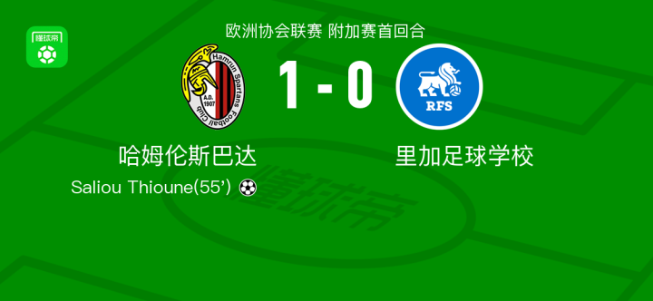 北京时间8月22日欧洲协会联赛 附加赛首回合,哈姆伦斯巴达对阵里加足球学校。哈姆伦斯巴达Saliou Thioune破门。最终比分哈姆伦斯巴达 1-0 里加足球学校。