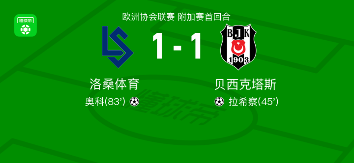 洛桑体育1-1贝西克塔斯,拉希察破门,奥科救主