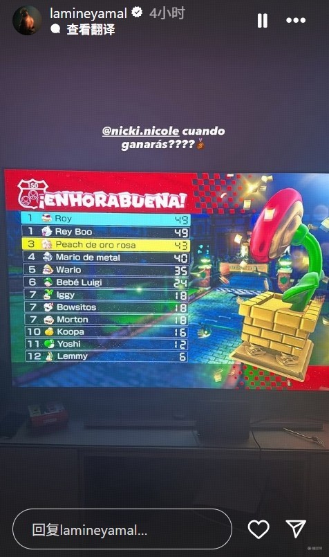 亚马尔与大7岁的绯闻女友公开互动,两人一起玩《马里奥赛车》三十元奥利奥 @懂球帝2025-08-22 11:048月22日,亚马尔在个人社媒上发布了一张游戏图片,并艾特了绯闻女友妮基-妮可。图中亚马尔晒出和妮可玩《马里奥赛车8》游戏的照片并艾特她道:“你什么时候能赢???”,同时妮可也在社媒上转发了亚马尔这条消息,两人此前已经传出过绯闻。妮基-妮可社媒照片相关阅读:【邮报:亚马尔卷入三角恋传闻,与阿根廷模特夜店亲吻 】展开更多