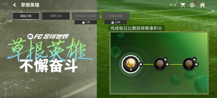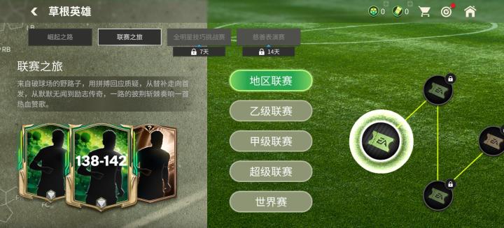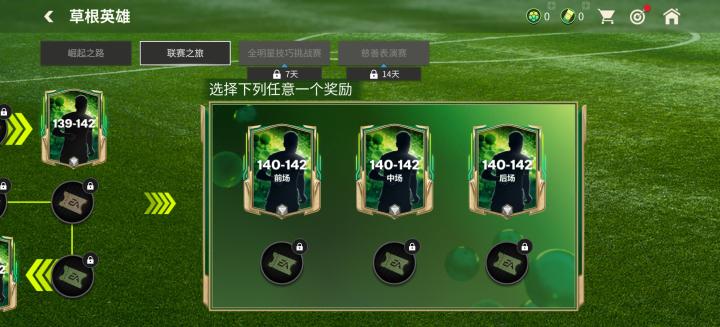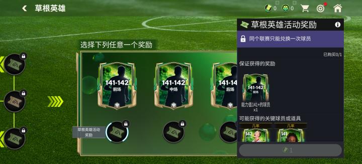 最高达到世界赛,领取完相关奖励后,可以额外解锁领取一张141-142能力值的草根英雄球员卡。玩家可以根据自己的喜好,选择领取球员卡的位置(前场、中场、后场)。