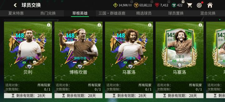 伴随草根英雄活动的开启,草根英雄团队1球员卡本周同步上线。本组球员卡基础能力值区间为139-148,其中,148能力值的马塞洛、博格坎普、贝利;143、145能力值的马塞洛,玩家都可以通过球员交换,定向、特惠交换获取。