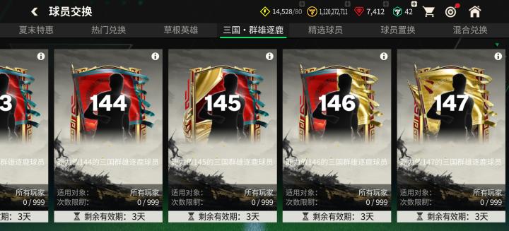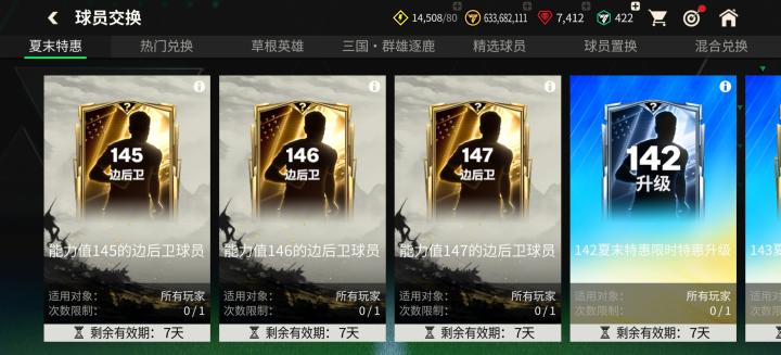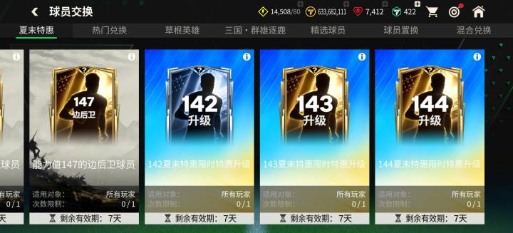 夏末特惠限时特惠升级交换中,玩家可以特惠交换获取142、143、144的混合球员,每个能力值各限量参与一次。